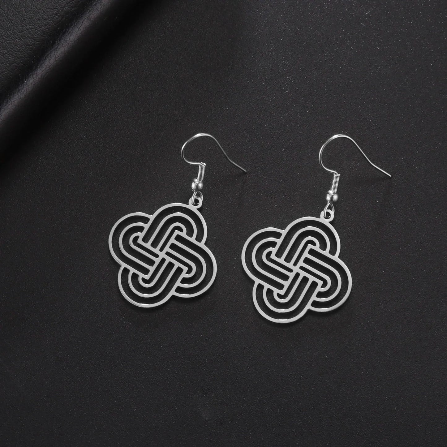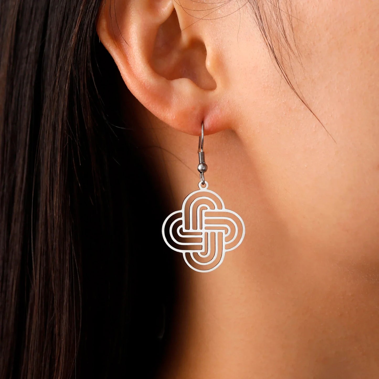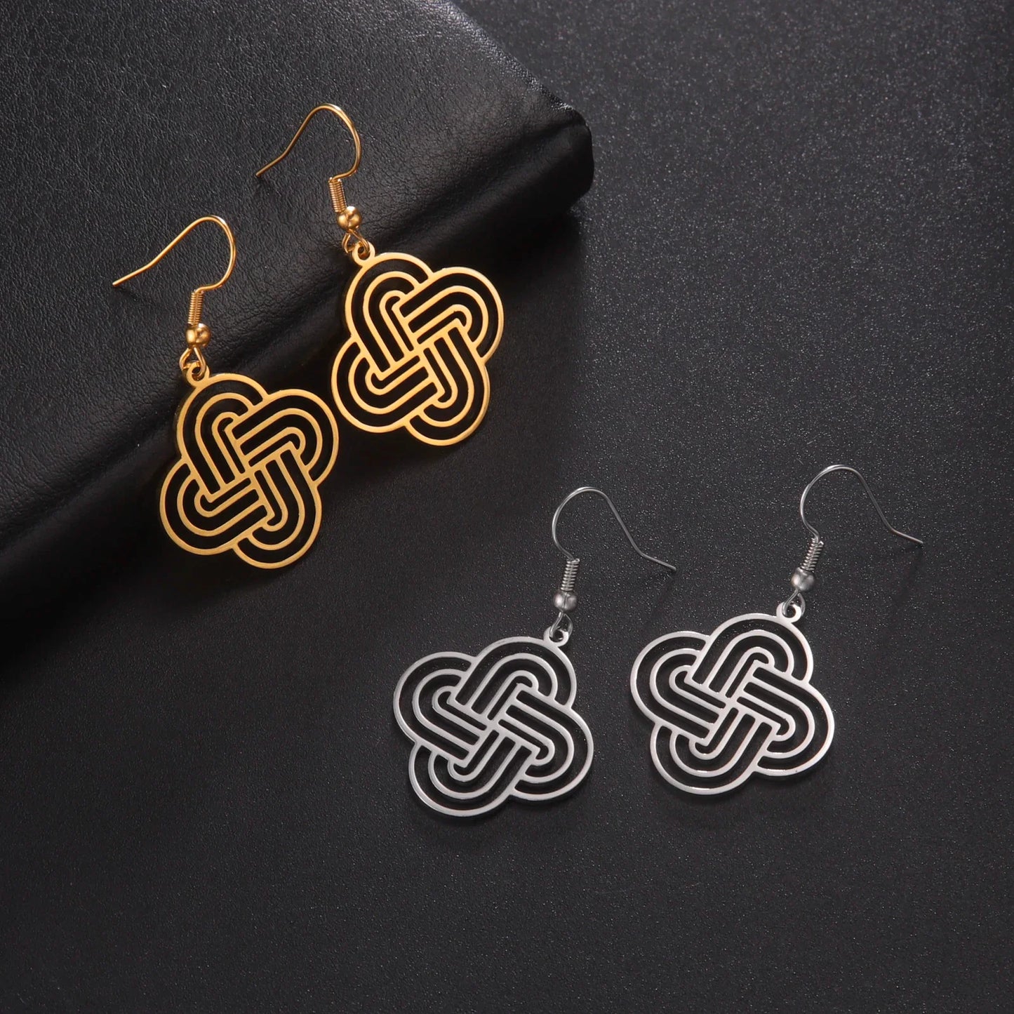 Elevate your jewelry collection with our Lovers Loop Drop Earrings. Crafted from stainless steel, these earrings feature a guilloche design inspired by Solomon's Knot. This ancient symbol of eternity is a beautiful representation of lasting love. Make a statement with these timeless and elegant earrings.
