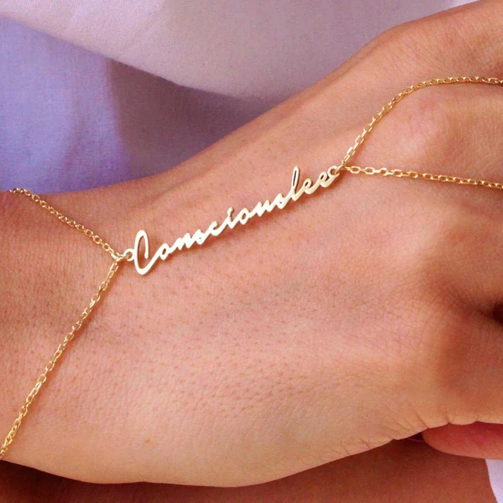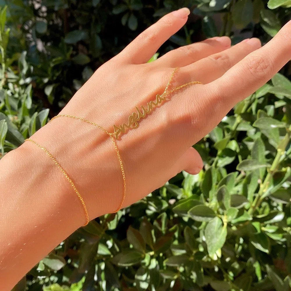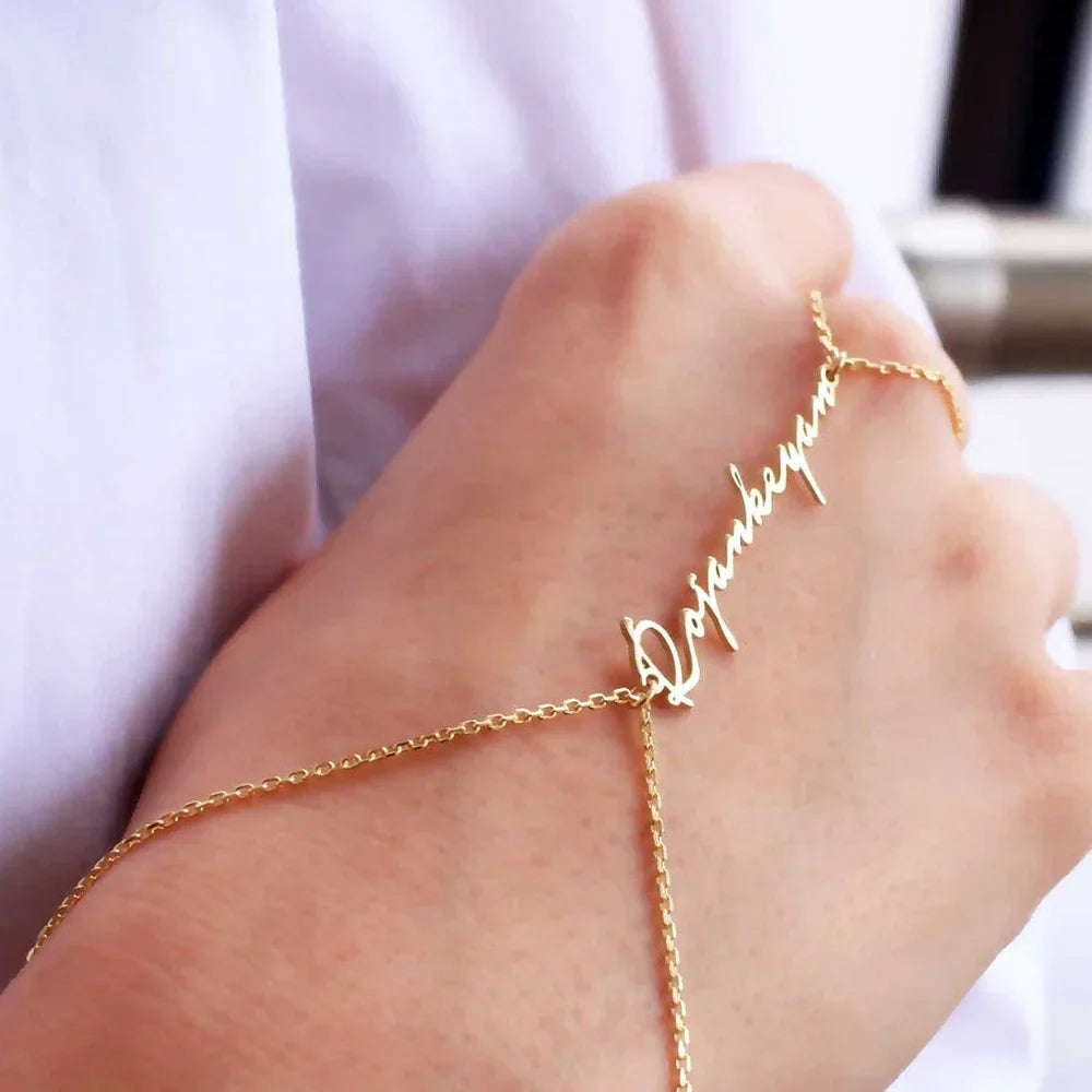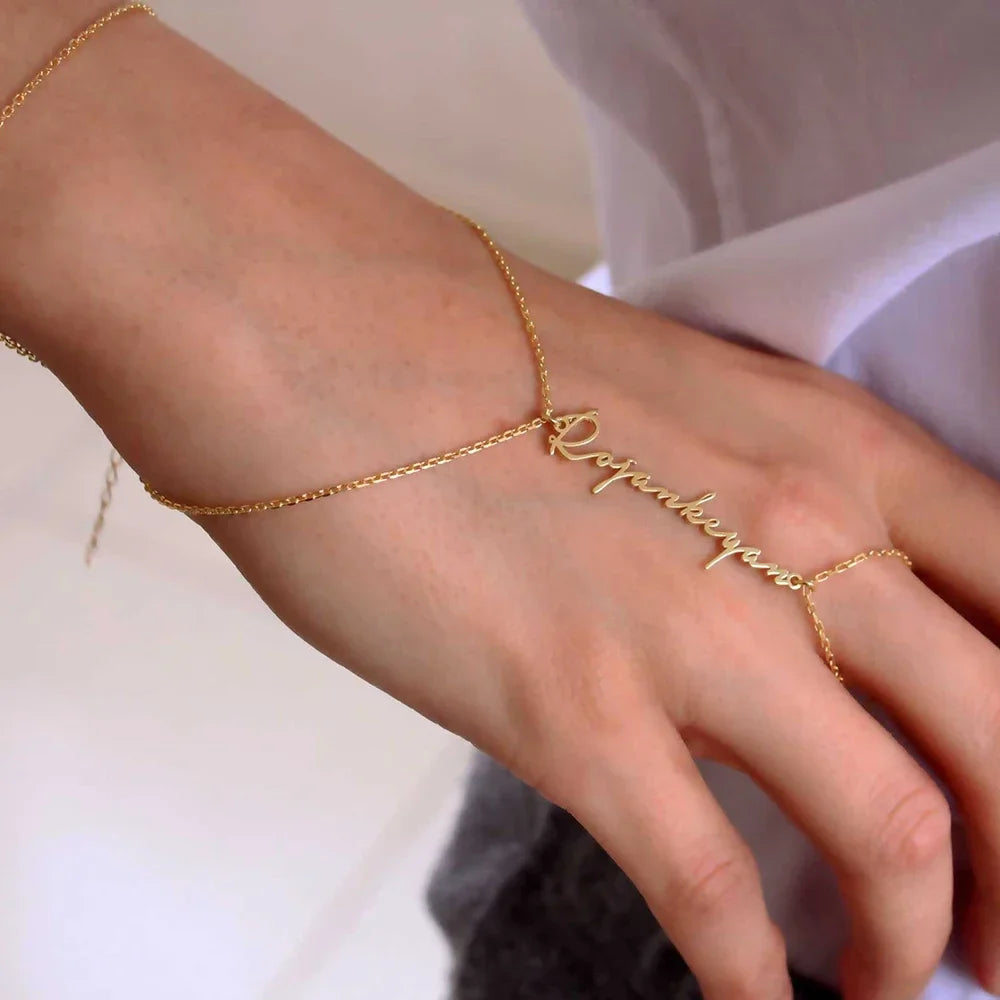 Indulge in the height of luxury with our Personalized Hand Chain. Adorned with delicate script lettering, this elegant piece is crafted from the finest materials to create a one-of-a-kind accessory that exudes sophistication. Whether it's a special gift for yourself or a loved one, this hand chain is sure to elevate any outfit and make a lasting impression. Discover the art of bespoke luxury with our Personalized Hand Chain.