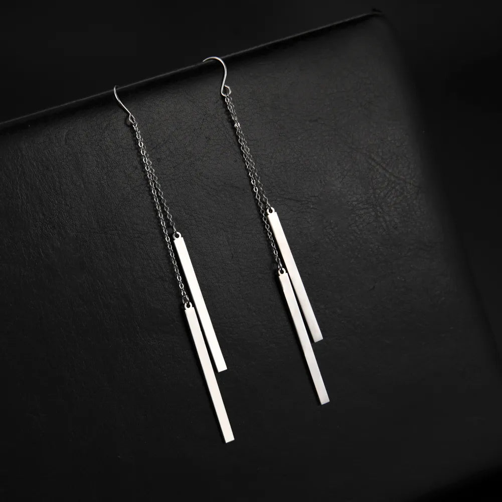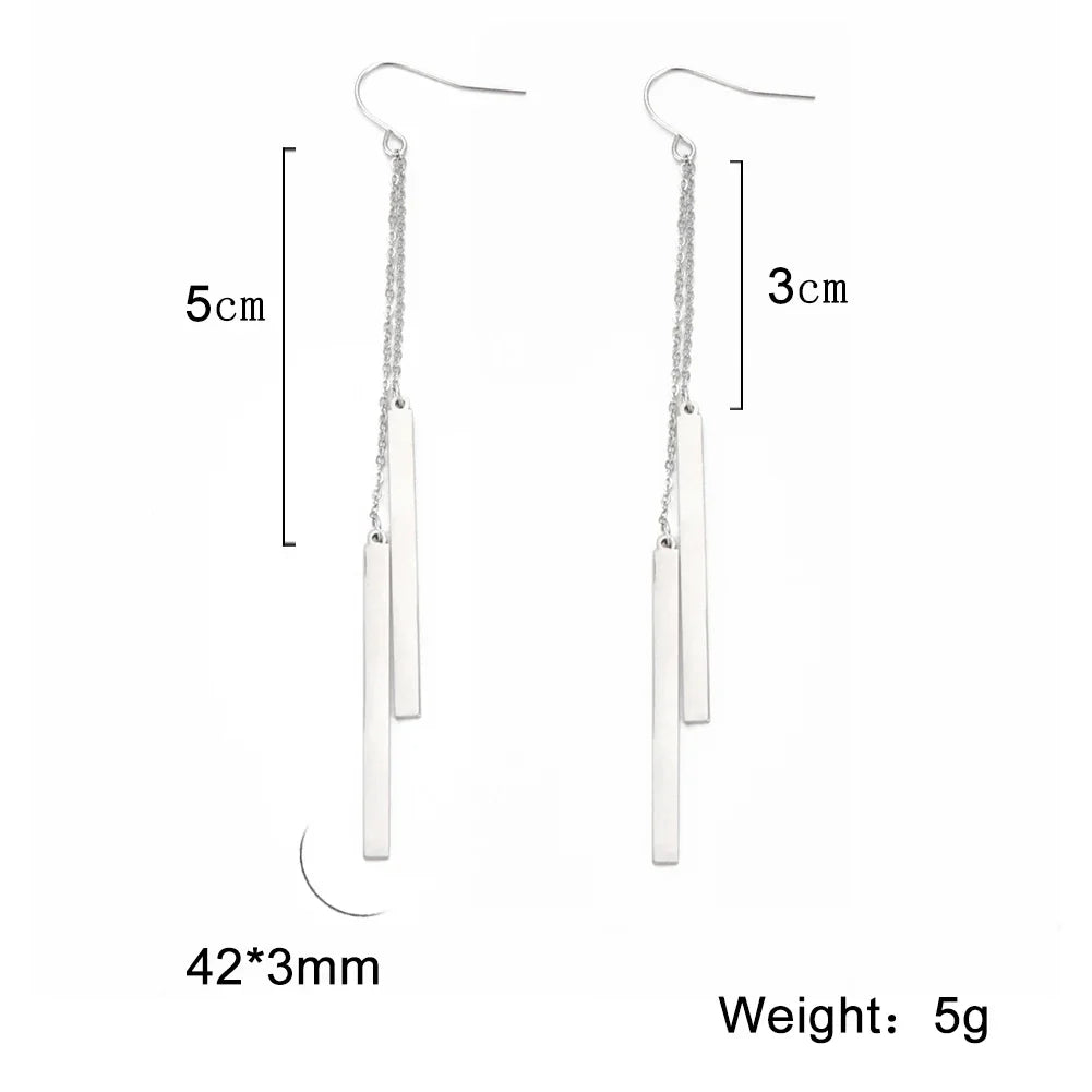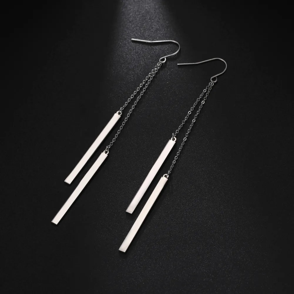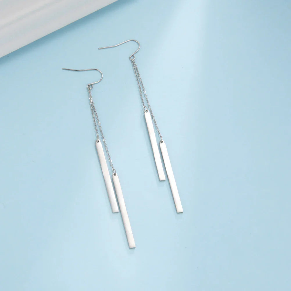 Sophisticated elegance meets modern simplicity with these long chain dangle earrings. Crafted from durable stainless steel, these rectangular bar earrings add a touch of refinement to any outfit. Elevate your style with these luxurious and timeless statement pieces.
